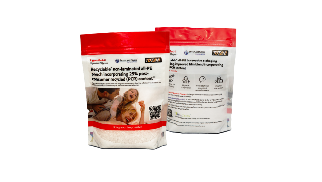 A case study in collaboration with ExxonMobil Signature Polymers and Totani America compared a 25% PCR (post-consumer recycled content) version of the film to a sample PET//PE lamination. The study showed minimal performance loss in key physical property categories.